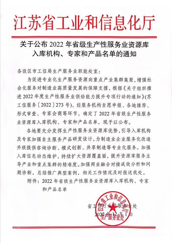 热烈祝贺我公司入库2022年江苏省生产性服务业资源库
