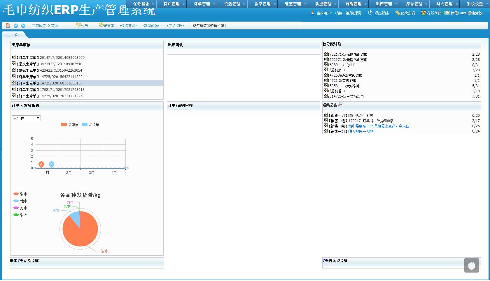 库存管理:成品库、半成品库、样品库、废品库、生坯库、调拨入库审核、外协入库、外协入库审核、漂染库、缝整库、白坯库、超产库、手动入库、手动入库审核、库存盘点、原料采购入库、原材料管理、拼纱管理、染纱管理、调拨管理、调拨记录、入库记录、原材料领取