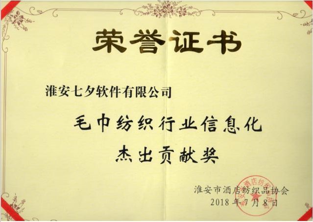 祝贺我公司获得淮安酒店纺织用品协会颁发的“毛巾纺织行业优秀服务企业”和“毛巾纺织行业信息化杰出贡献奖”,做最专业的毛巾纺织行业ERP系统