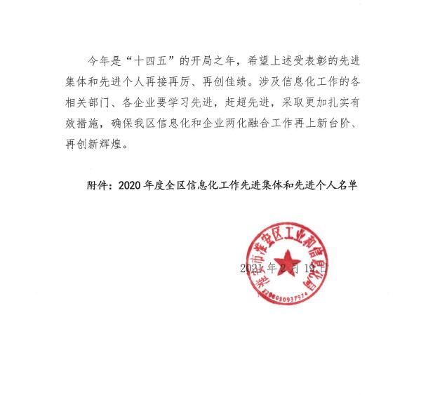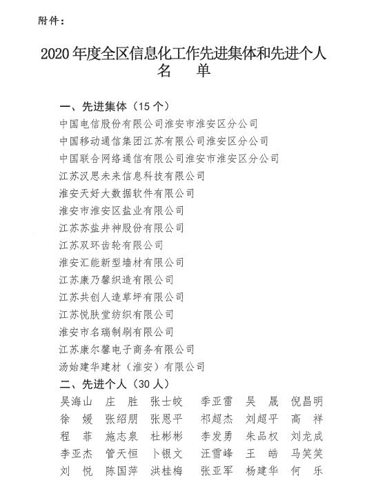 我公司和公司技术总监连续两年分别获得淮安区工信局颁发淮安区信息化工作“先进集体”和“先进个人”称号
